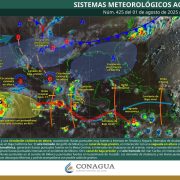 Mesa Central: Cielo parcialmente nublado por la mañana y nublado durante la tarde con lluvias puntuales fuertes en Puebla, chubascos en Guanajuato, Querétaro, Hidalgo, Morelos y Tlaxcala. Todas las lluvias con descargas eléctricas y posible caída de granizo. Ambiente fresco por la mañana y cálido a caluroso durante la tarde. Viento de dirección variable con rachas de 40 a 60 km/h y posibles tolvaneras en Guanajuato, Querétaro, Hidalgo, Morelos, Tlaxcala y Puebla.