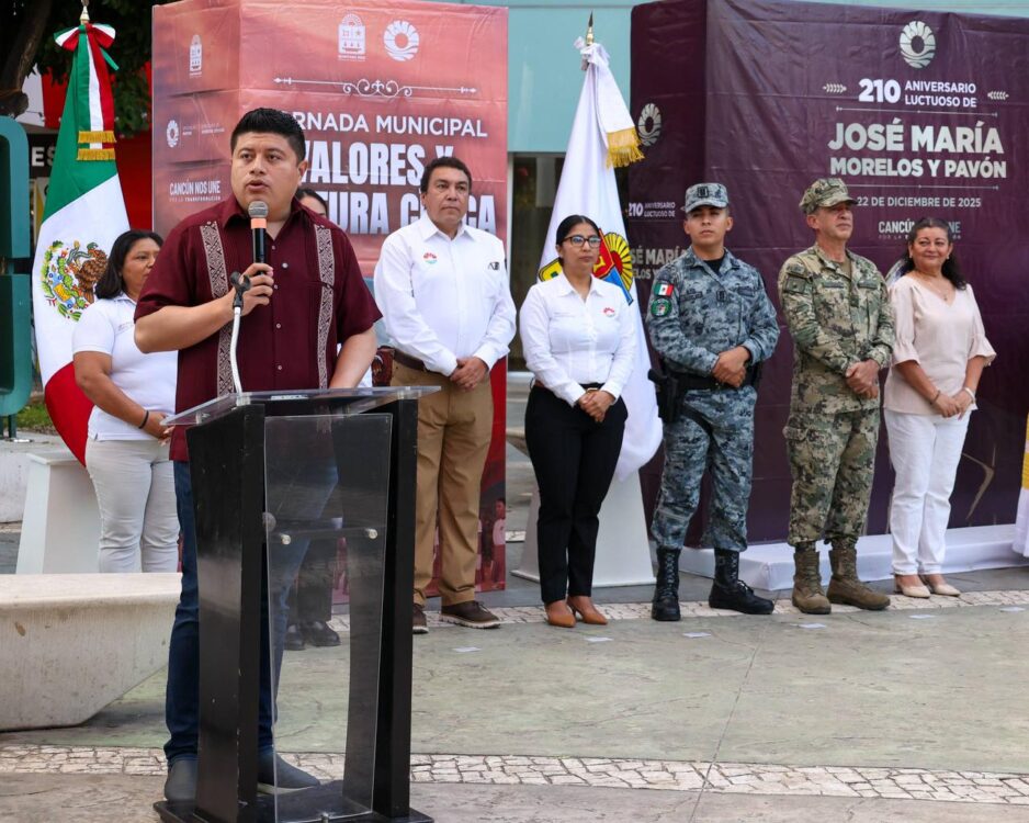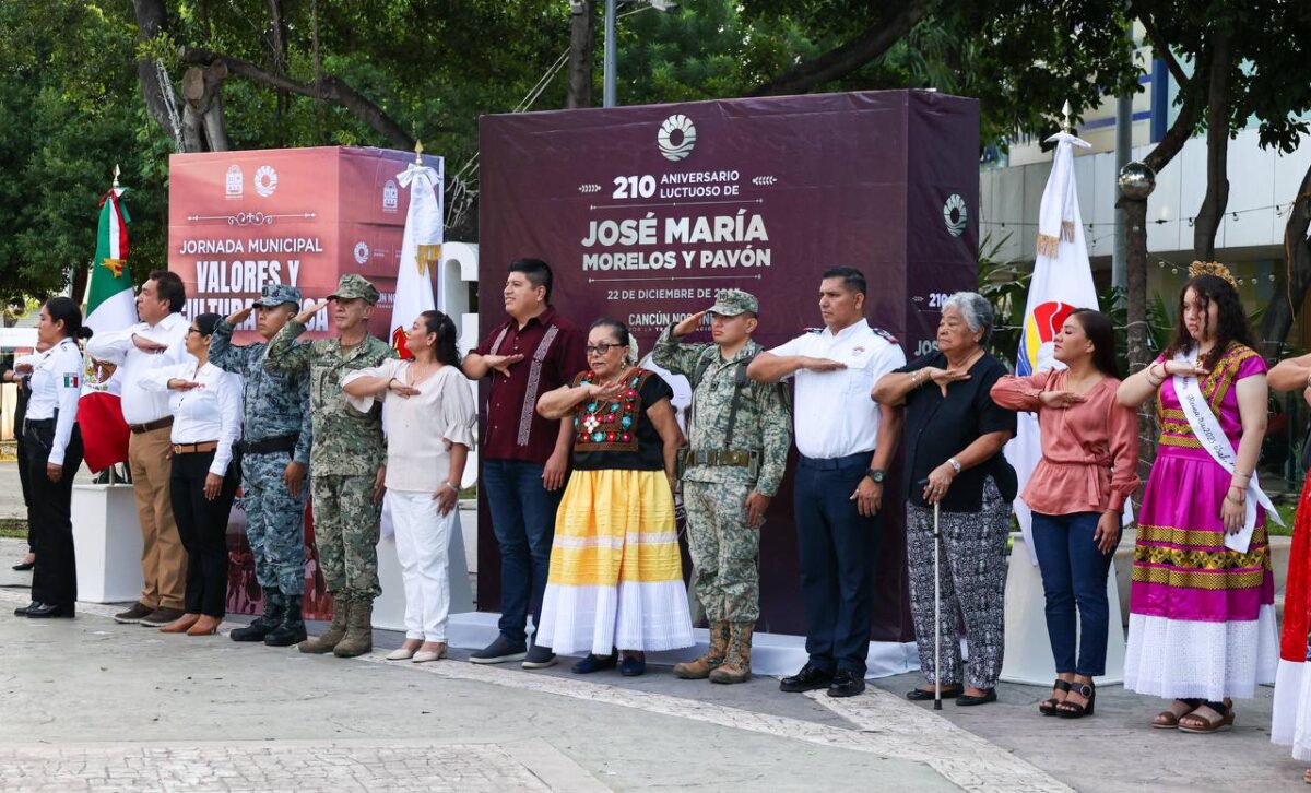 Cancún.- Con la bandera a media asta, funcionarios municipales y ciudadanos en general conmemoraron el 210 aniversario luctuoso de José María Morelos y Pavón, que se llevó a cabo en el parque “La Corregidora” mejor conocido como “El Crucero”.