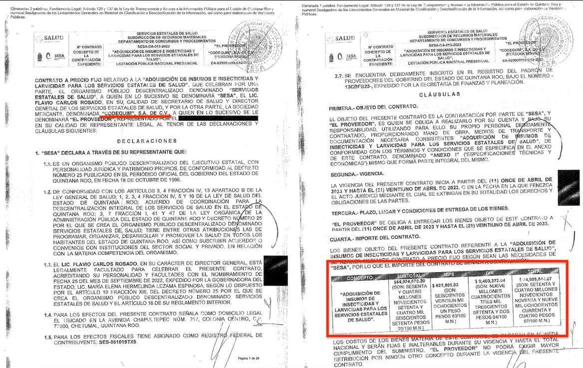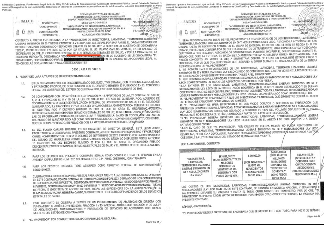 El otro contrato fue el SESA-DA-AD-045-2023, firmado el 31 de agosto de 2023, por un monto de $68 millones 418 mil 410.58 pesos para la adquisición de insecticidas, larvicidas, termonebulizadores ligera Swing Fog SN 50 y nebulizadores ULV Leco, que fueron entregados en un plazo de 15 dias, entre el 1 y el 15 de septiembre de ese año.
