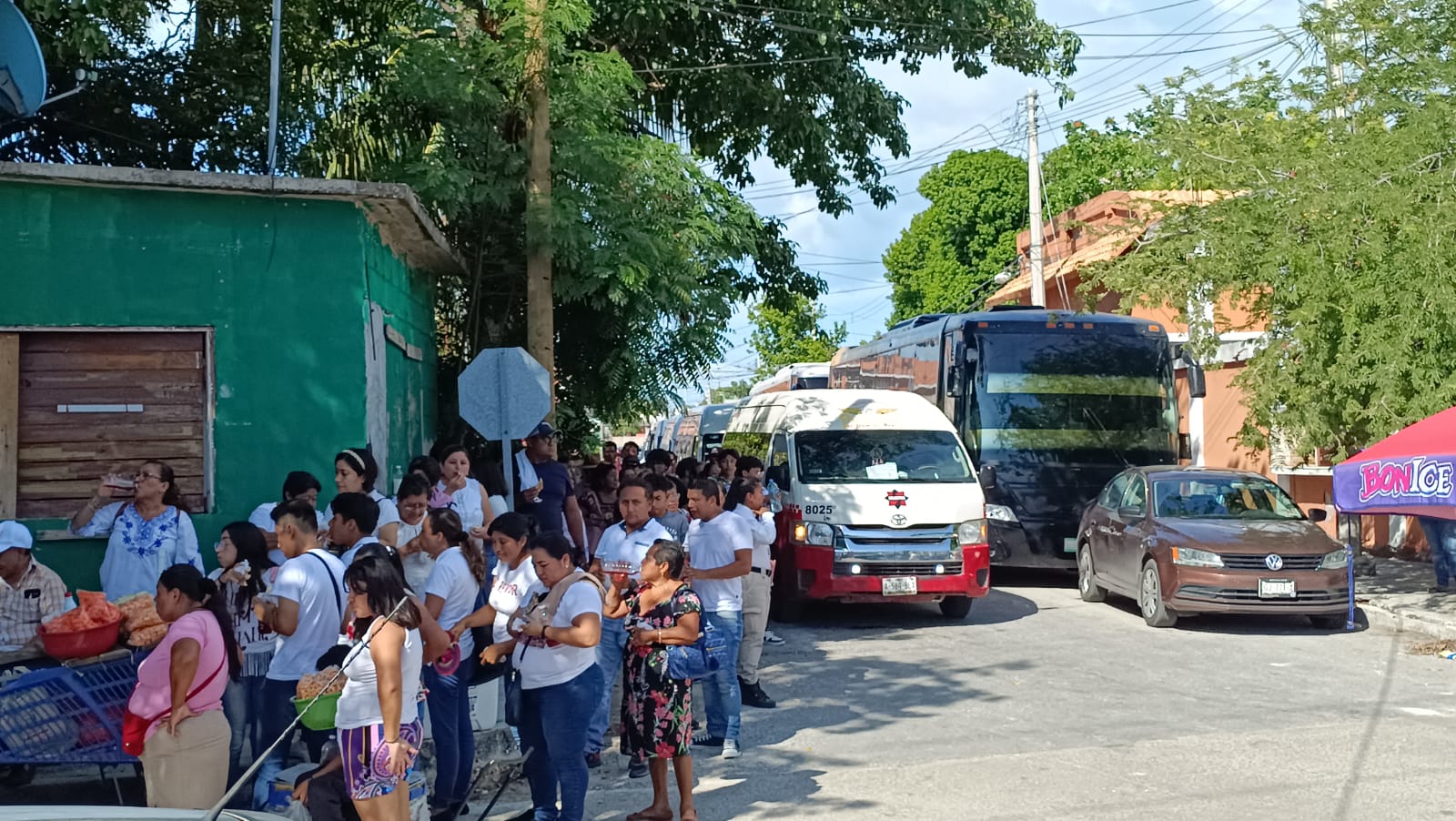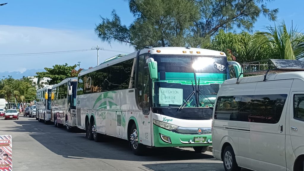 Acarreados en la asamblea informativa de Claudia Sheinbaum Pardo, que se llevó acabo hoy a las 16:00 horas en el Polideportivo Chechén; en los alrededores del espacio deportivo, llegaron más de 16 combis y 10 autobuses, procedentes de comunidades rurales del municipio del Carmen, así también de Champotón, Escárcega y Candelaria, en su mayoría con pancartas en apoyo a la ex jefa de gobierno de la Ciudad de México.
