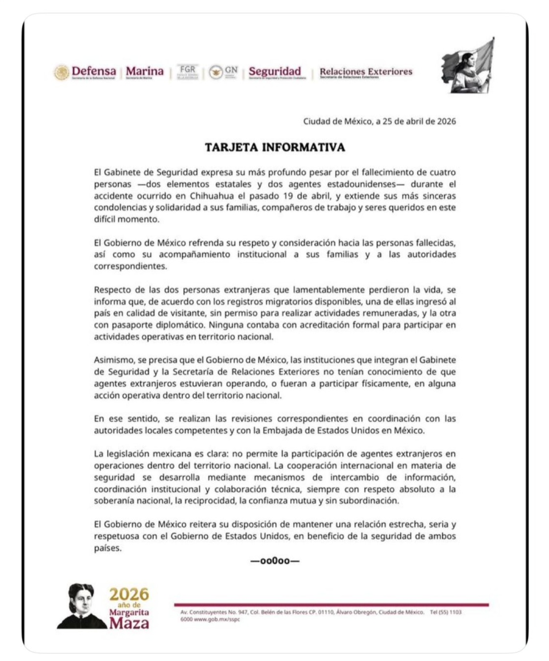 El Gabinete de Seguridad confirmó el deceso de las víctimas y expresó condolencias a sus familias, al tiempo que subrayó que el caso está siendo analizado en coordinación con autoridades locales y con la Embajada de Estados Unidos en México. Más allá del lamentable hecho, la información oficial reveló un punto clave: las autoridades mexicanas no tenían conocimiento de la participación directa de agentes extranjeros en acciones operativas dentro del país.