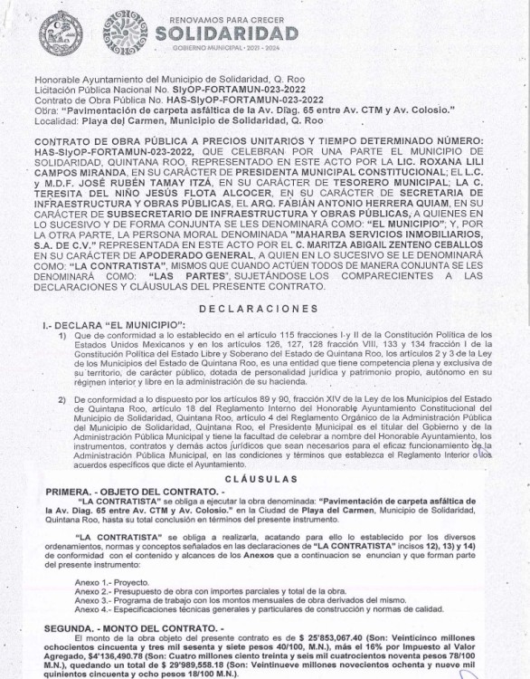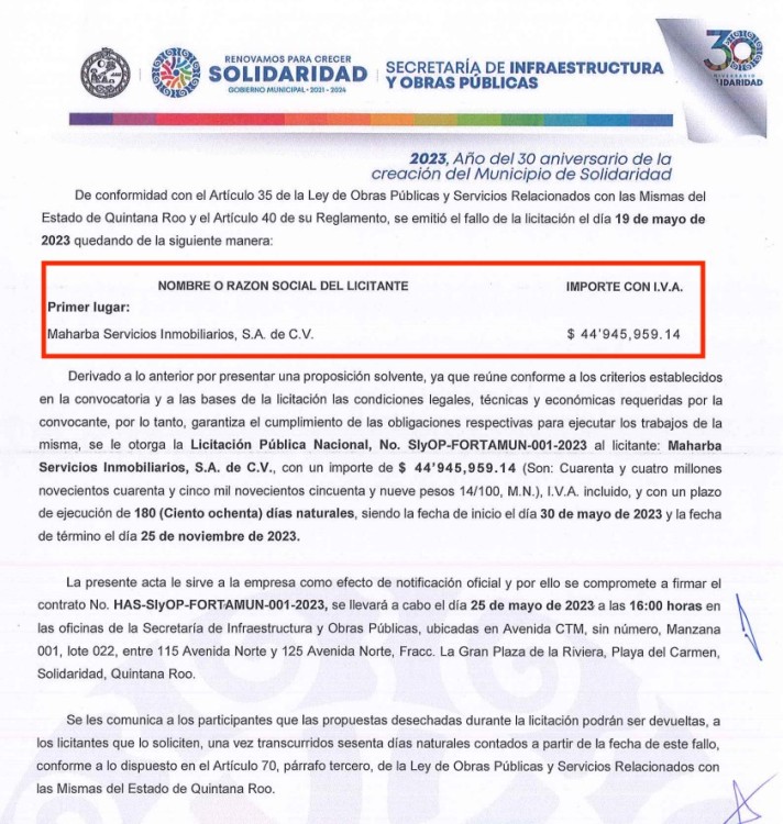 A la empresa MAHARBA Servicios Inmobiliarios, el municipio de Solidaridad el recién terminado año 2023 le otorgó el mayor contrato económico del año pasado. Se trata de la obra remodelación de la Plaza Cívica 28 de Julio del Municipio de Solidaridad 1era Etapa, que según el contrato SIyOP-FORTAMUN-001-2023 manejó un presupuesto de $44,945,959.14 pesos.