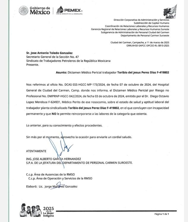 “De acuerdo con el afectado, Toribio Pérez Díaz, ha enviado correo y oficios a los jefes de Recursos Humanos de Pemex, de la calle 33 de Ciudad del Carmen, así también, a la Sección 47 del STPRM, sin embargo, no hay respuestas, hasta el momento”, manifestó.