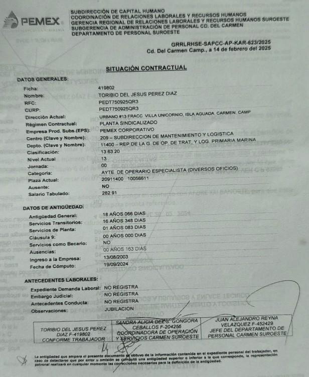 Indicó que el Sindicato de Trabajadores Petroleros de la República Mexicana (STPRM), lo abandonó, a pesar de que trabajó 23 años para la petrolera, Pérez Díaz, tiene la ficha 419802, comenzó a laborar en Pemex desde el 13 de agosto del 2003. El 11 de octubre del 2024, fue jubilado bajo el régimen de la AFORE, por la AFORE Banorte siglo XXI, sin embargo, hasta el momento no ha recibido ningún pago su pensión.