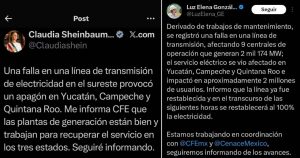 La Presidenta Claudia Sheinbaum igualmente, a través de sus redes sociales, dio los primeros pormenores de la falla que afectó el suministro de energía eléctrica, telefonía —residencial y celular— y una serie de servicios que se dejaron de prestar durante las aproximadamente 2 horas que tardó en restablecerse normalmente el suministro de energía.