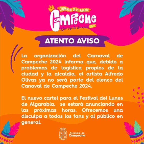 La mañana de este sábado se dio a conocer la modificación en la cartelera del carnaval de Campeche. Esto casuó tremenda sorpresa para los fanáticos de Alfredo Olivas quienes externaron su tristeza.