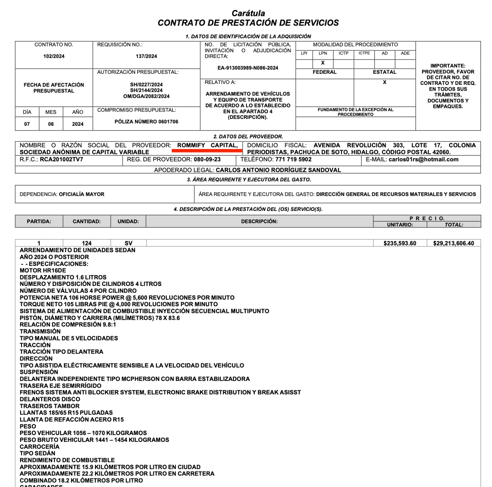 El año pasado obtuvo el contrato 102/2024 para arrendar 175 vehículos por un monto de  $155,754,234.72 pesos; en 2023, firmó el contrato 421/2023, por un monto de $49,012,320 pesos. En total suma contratos por más de 300 millones de pesos en la actual administración hidalguense.