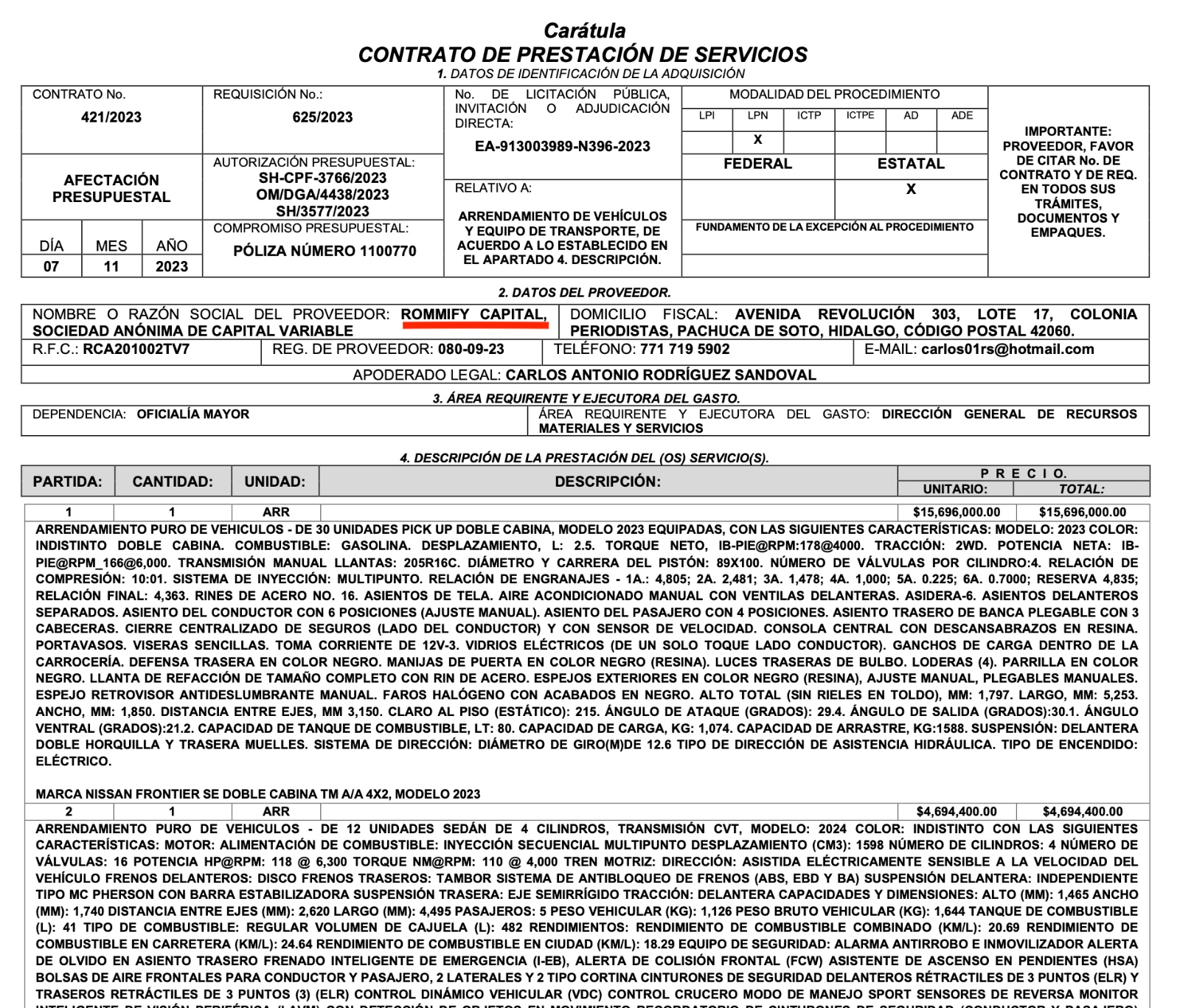 Recientemente firmó el contrato PMMR-SA-026-FORTAMUN-2025, 2 de julio de 2025, para el arrendamiento de patrullas en el municipio de Mineral de la Reforma por un monto de $13,777,737.60 pesos; en el DIF Estatal obtuvo el contrato DIF/DAJ/0120/2025, enero de 2025, para el arrendamiento de vehículos y equipo de transporte 2025-2026 por un monto de $26,352,339.78 pesos; el contrato 034/2025, del 7 de abril 2025, para el arrendamiento 58 camionetas pick up, modelo 2025, por un monto de $23,100,184.32 pesos; el contrato 033/2025, firmado el mismo 7 de abril para el arrendamiento de vehículos por un monto de $12,550,692.38 pesos.