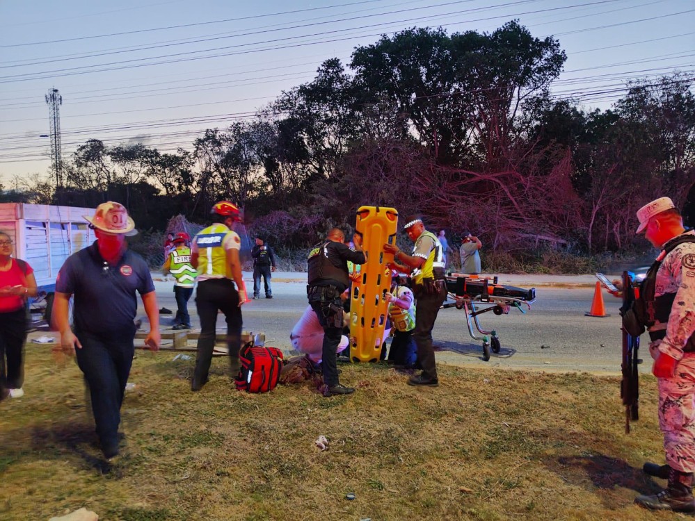 En una rápida y coordinada respuesta, elementos de la Secretaría de Protección Civil, Prevención de Riesgos y Bomberos, en conjunto con la Secretaría de Seguridad Ciudadana Municipal y con apoyo de la Guardia Nacional, atendieron un fuerte accidente vehicular registrado sobre la carretera federal 307, en el tramo Cancún–Playa del Carmen, antes del ingreso a la cabecera municipal.