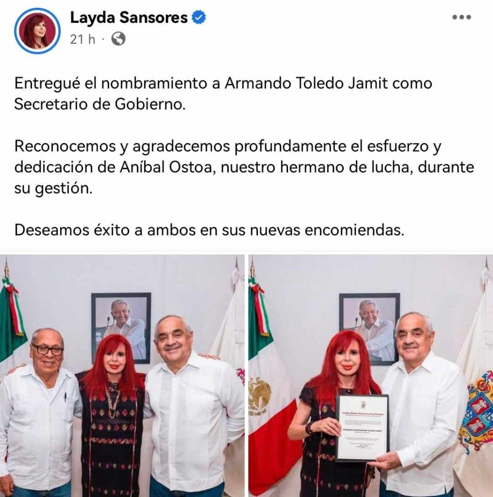 “Deseamos éxito a ambos en sus nuevas encomiendas”, manifestó Sansores San Román en redes sociales.