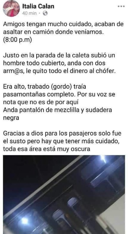 La noticia circuló la noche de ayer a través de grupos de esta comunidad en redes sociales, lamentando el atracó del cual fueron víctima. Denunciaron ver a una persona subir al camión con dos armas, despojando al operador de la unidad de todo el dinero que traía.