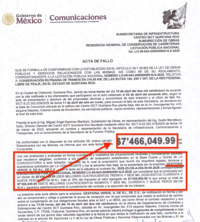 Tras la reunión del pasado 23 de marzo con el senador Eugenio Segura, la empresa Gestiona Verde S de RL de CV obtuvo el pasado 15 de abril, a través de la licitación pública LO-09-643-009000950-N-5-2025, la obra para la conservación rutinaria de tramos en 316.50 km, de las rutas 184, 295 y 307 de la red federal libre de peaje en el estado de Quintana Roo.