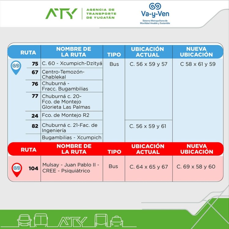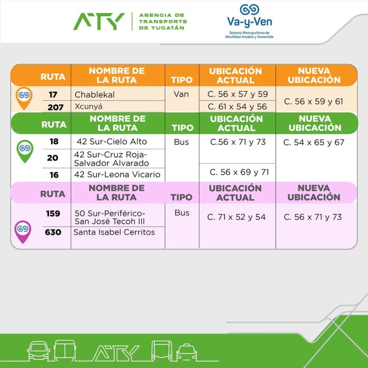 A partir del viernes 31 de enero, la Agencia de Transporte de Yucatán (ATY) realizará una nueva reubicación de 15 paraderos de autobuses y combis, como parte de un plan para mejorar la movilidad y seguridad en las principales vialidades de la ciudad.