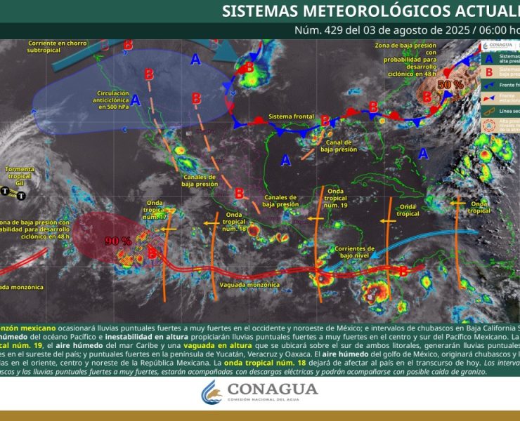 Para hoy, el monzón mexicano, ocasionará lluvias puntuales muy fuertes en Sinaloa y Durango; y puntuales…
