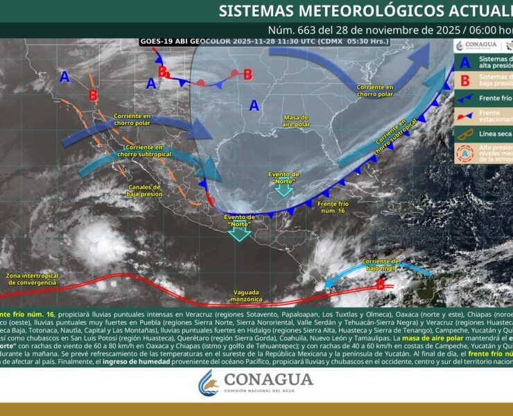 El frente frío número 16 avanza este viernes hacia el sureste del país dejando a…