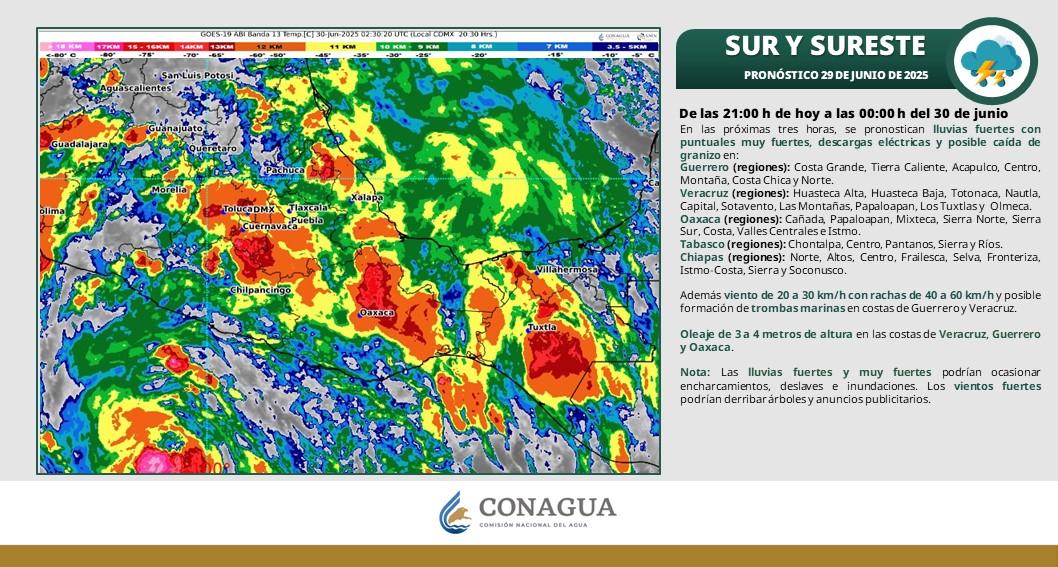 De acuerdo con el pronóstico del Servicio Meteorológico Nacional, estados como Veracruz, Oaxaca, Chiapas, Tabasco, Campeche y Quintana Roo recibirán lluvias intensas, mientras que entidades del centro y occidente como Guerrero, Morelos, Estado de México y Puebla registrarán precipitaciones muy fuertes, acompañadas de actividad eléctrica, rachas de viento y posible caída de granizo. Estas condiciones podrían provocar deslaves, inundaciones, encharcamientos y aumento de niveles de ríos y arroyos, especialmente en comunidades rurales y zonas urbanas con infraestructura deficiente.