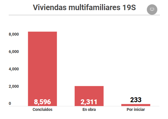 De los 2,997 departamentos afectados, el 40% (1,220) se encuentra actualmente en obra, mientras que un 3.74% (112) aún espera el inicio de trabajos. A pesar de los retrasos, el 55.56% (1,665) de estos departamentos ya ha sido entregado a sus propietarios.