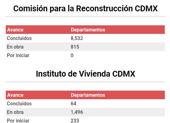 Según la Comisión para la Reconstrucción, de las 11,140 viviendas multifamiliares dañadas por el sismo, 8,596 han sido concluidas. Sin embargo, 2,311 viviendas siguen en proceso de obra y 233 aún no han iniciado, lo que significa que el 22.8% de las viviendas afectadas están lejos de estar terminadas. Aunque el Gobierno capitalino destaca un avance significativo, estas cifras revelan que muchas familias damnificadas todavía no pueden regresar a sus hogares siete años después del desastre.