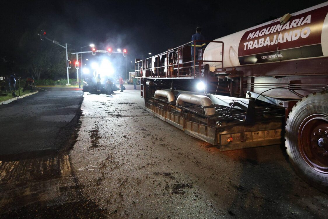 En el primer tramo, de 4.8 kilómetros, que va de la Avenida Nichupté a la Avenida Niños Héroes, se aplica la técnica de reciclado de pavimento asfáltico en sitio mediante aire caliente, conocida como “Dragón”, la cual permite reutilizar el material existente y colocar una nueva carpeta asfáltica, mejorando la resistencia y durabilidad de la vialidad. Este segmento ha completado todo el trabajo de pavimentación, a falta de señalética y detalles, representando un avance del 90.50 por ciento.