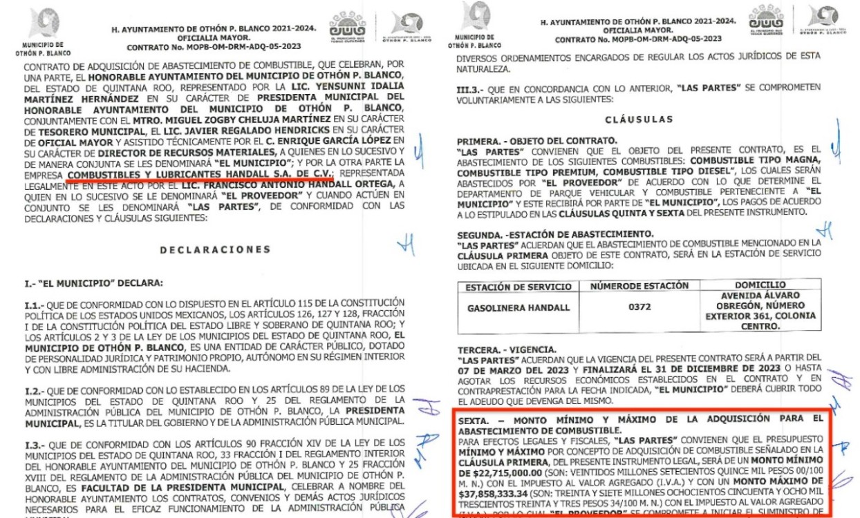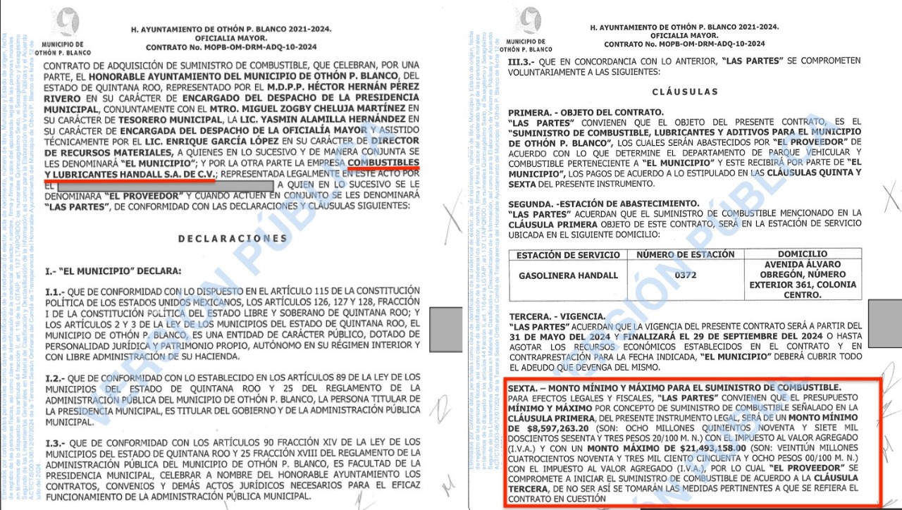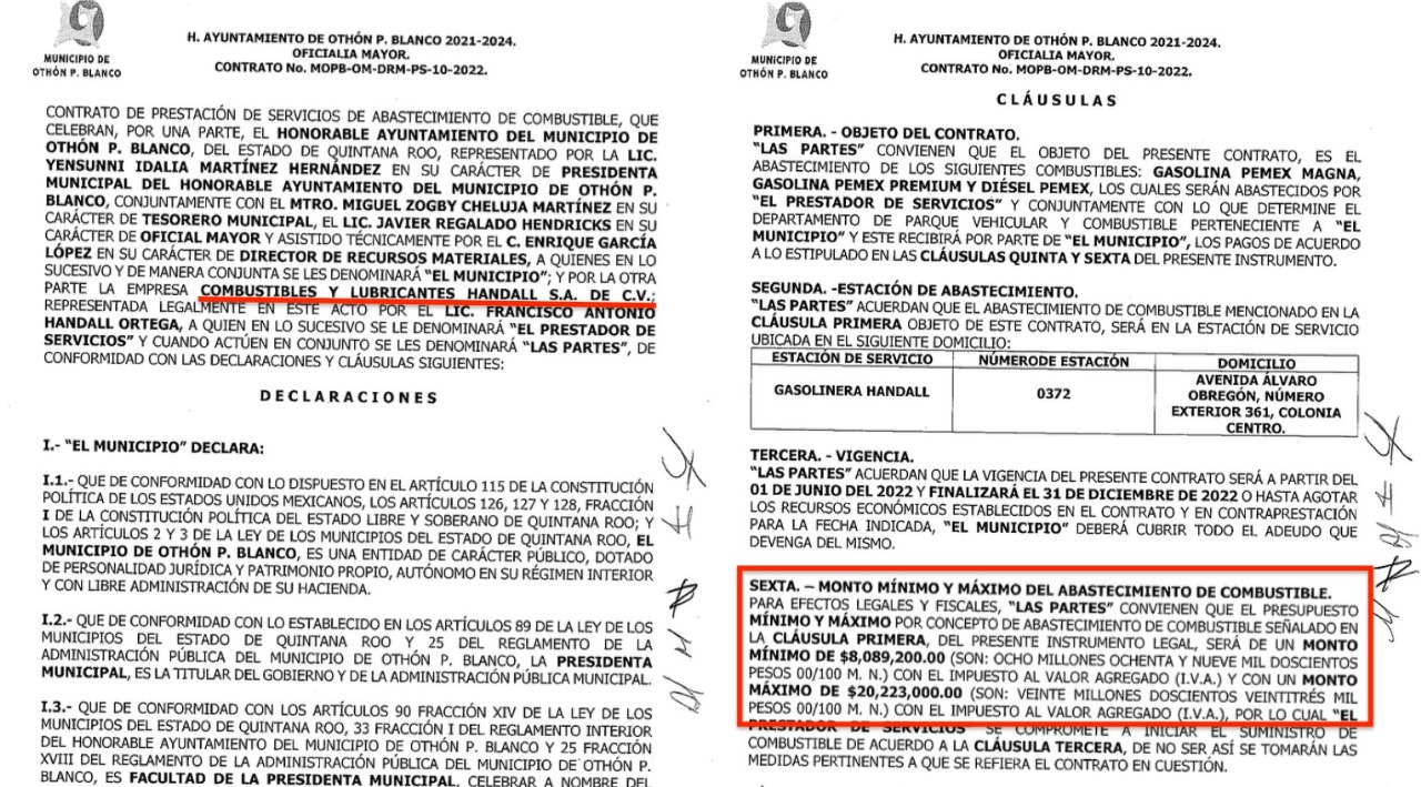 Anteriormente, el H. Ayuntamiento de Othón P. Blanco entregó el 7 de marzo de 2023, el contrato MOPB-OM-DRM-ADQ-05-2023 por un monto ejercido de $34 millones 829 mil 666.67 pesos para el servicio de venta de combustible desde la fecha de la firma del contrato hasta el 31 de diciembre de 2023. Este contrato fue avalado con la firma de la alcaldesa Yensunni Martínez.