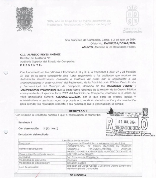 Tan solo en el Fondo para Inversión Pública Productiva del Municipio de Campeche se encontraron irregularidades por 10 millones 309 mil 565.76 pesos en un contrato de obra pública