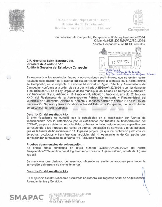 La Asecam asegura que estos recursos no justificados se dividieron a través de tres entes auditados: Ingresos Locales y Financiamientos, Fondo para Inversión Pública Productiva del Municipio de Campeche y Sistema Municipal de Agua Potable y Alcantarillado de Campeche Smapac.