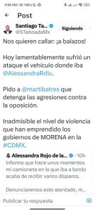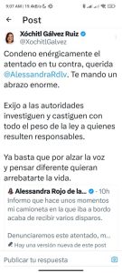 La candidata a la alcaldía Cuauhtémoc por la coalición Va X la Ciudad de México, Alejandra Rojo de la Vega, denunció ataque armado