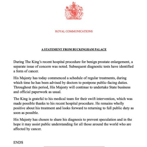 La noticia se hizo pública pues fue el propio Palacio de Buckingham quien dio el comunicado. Ellos realizaron una publicación estilo carta donde daban a conocer toda la situación del Rey. Ahí se explica que el monarca fue internado en estado de emergencia por problemas de salud. Después de los estudios correspondientes, los médicos descubrieron que se trata de cáncer de próstata. Los doctores dicen que la próstata se encontraba muy agrandada e inflamada. Terminan aclarando que es benigno y que el Rey Carlos tiene muchas posibilidades de salir de está.