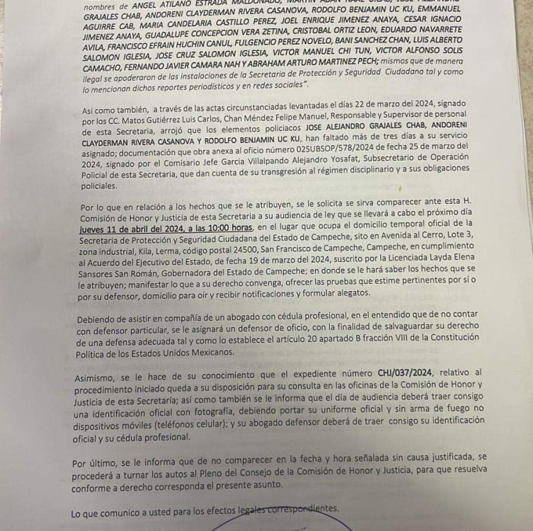 Citan a comparecer a policías de Campeche por parte de la Comisión de Honor y Justicia de la Secretaría de Protección y Seguridad Ciudadana (SPSC).