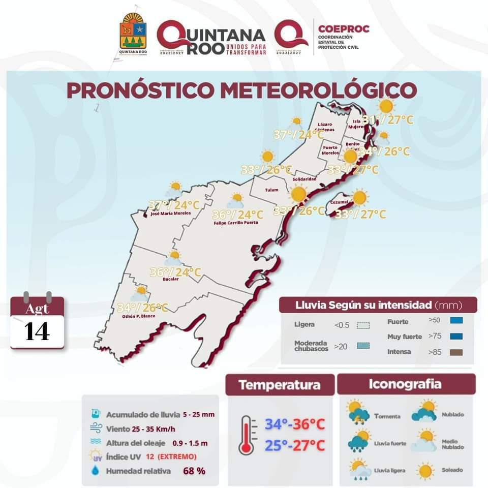 Clima de Quintana Roo hoy 14 de agosto del 2023