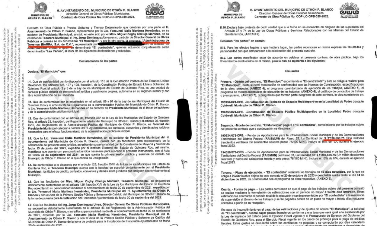 En total son 6 contratos diversos: COP-IO-OPB-044-2023, firmado el 24 de noviembre de 2023, por $1,860,334.70 pesos para construcción de alumbrado público en la Av. Independencia, entre calle Cristóbal Colón y calle Laguna de Bacalar, en Chetumal; el contrato COP-LO-OPB-040-2023, firmado el 19 de octubre del año pasado, y que tiene cuatro partidas y montos pagados para la construcción y rehabilitación de espacio público Multideportivo en la localidad de Francisco Villa, por $659,240.74 pesos, también para la construcción de techado en área de impartición de Educación Física en el Colegio de Bachilleres de la localidad de Nicolás Bravo y otro en la comunidad de Morocoy, por $2,327,401.69 pesos y $708,490.71 pesos, respectivamente, y un cuarto pago por $294,138.87 pesos para la obra en la localidad de Morocoy.