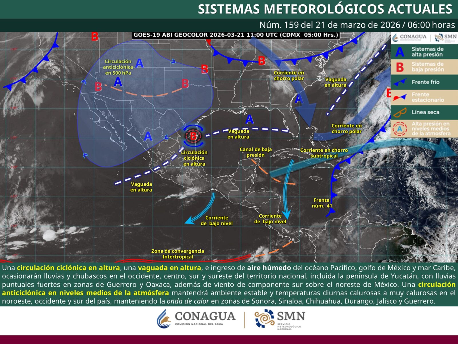 Para este 21 de marzo, la interacción de una circulación ciclónica en altura en el noreste, una vaguada sobre el territorio nacional y el ingreso de humedad desde el océano Pacífico, el golfo de México y el mar Caribe provocará condiciones de inestabilidad atmosférica. Esto se traducirá en lluvias y chubascos acompañados de descargas eléctricas en entidades del occidente, centro, sur y sureste.
