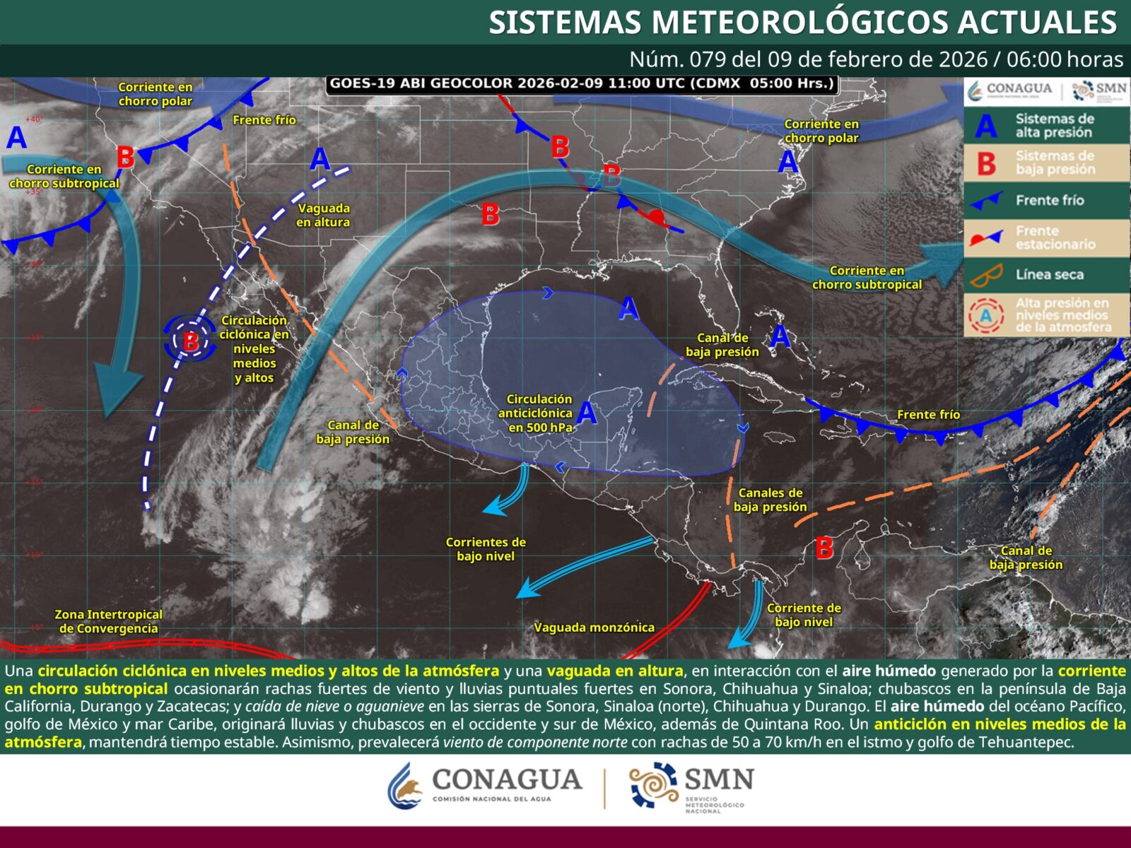 En el noroeste y norte del territorio, una circulación ciclónica en niveles medios y altos, combinada con una vaguada en altura y el aporte de humedad de la corriente en chorro subtropical, generará condiciones de tiempo severo. Este patrón favorecerá lluvias puntuales fuertes en Sonora, Chihuahua y Sinaloa, así como chubascos en la península de Baja California, Durango y Zacatecas, acompañados de rachas intensas de viento.