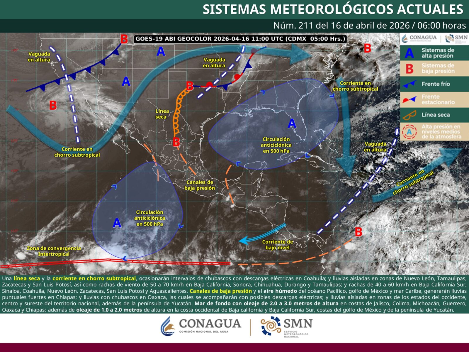 Este 16 de abril de 2026, México enfrenta un escenario meteorológico marcado por fuertes contrastes: mientras el norte y occidente resienten altas temperaturas y ráfagas intensas de viento, el sur y sureste registran lluvias con actividad eléctrica, en una combinación de fenómenos que mantiene bajo vigilancia a autoridades y población.