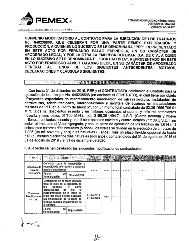 Este contrato también fue sujeto a 19 convenios modificatorios, el último firmado el 20 de febrero de 2020 por el funcionario Roberto Patlán Esponda, se extendió el plazo de ejecución hasta el 1 de octubre de 2025 y el monto hasta los 12,661 millones de pesos más 620 millones de dólares, lo que significa un 198.44% más que el monto original.
