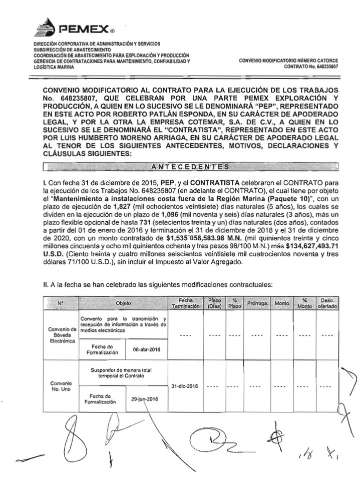 Empecemos con el contrato 648235807 para mantenimiento a instalaciones Costa Fuera de la Región Marina (Paquete 10) que fue adjudicado el 31 de diciembre de 2015 y tenía un plazo de ejecución de 1,096 días (3 años), más un plazo flexible de hasta 731 días naturales, contados a partir del 1 de enero de 2016 y terminación al 31 de diciembre de 2018 y el 31 de diciembre de 2020. y un monto original en número redondos por 1,535 millones de pesos más 134 millones de dólares.