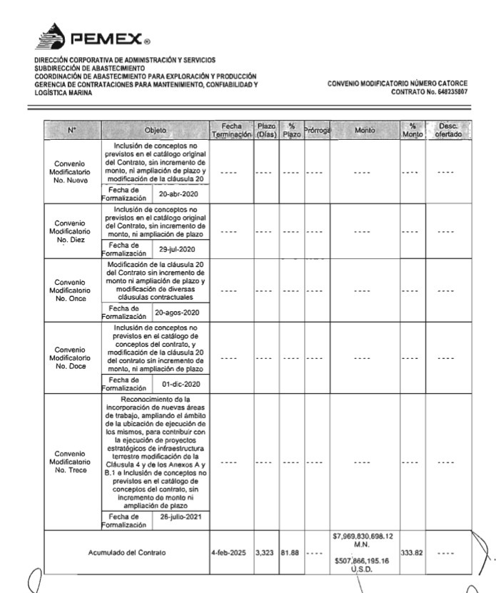 Por último: el contrato 648235806 para proyectos especiales de mantenimiento y adecuación de infraestructura en instalaciones marinas por un monto original de 2,261 millones de pesos más 199 millones de dólares. El plazo de ejecución era por 1,614 días, antes que venciera el plazo se firmaron hasta 13 convenios para ampliar el monto y el plazo. El nuevo monto, a la fecha, es de 9,571 millones de pesos más 424 millones de dólares, una alza que representa el 196.42% al monto original, mientras la ejecución se extendió hasta el 30 de abril de 2025.