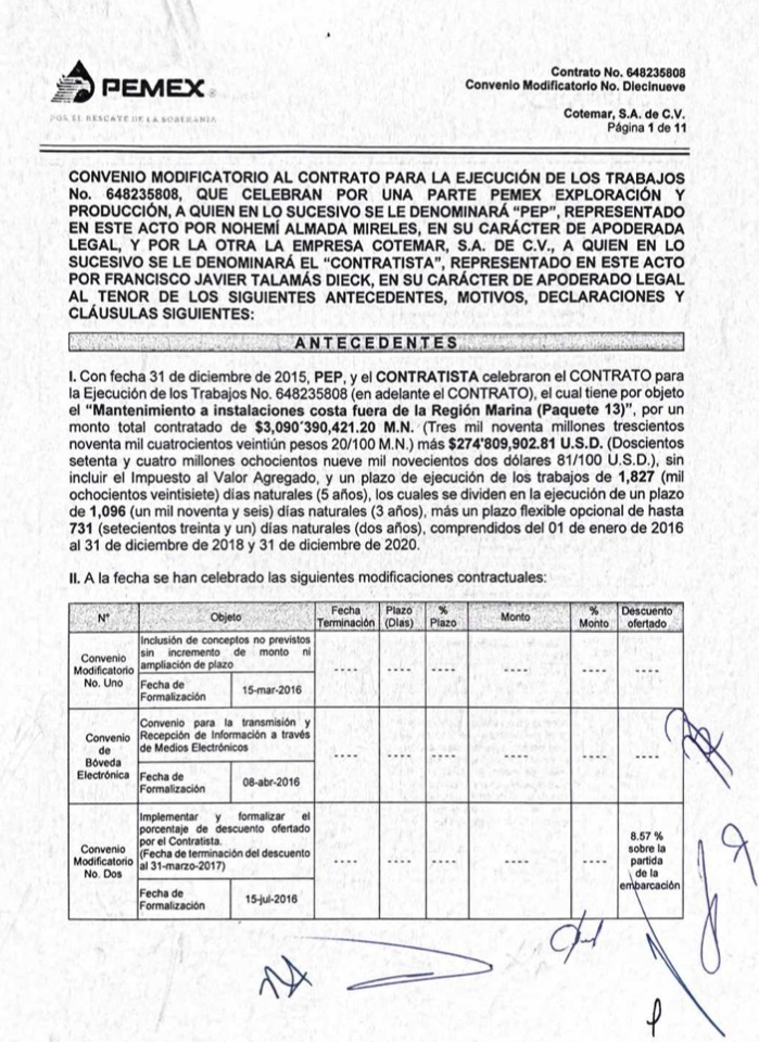 Los últimos accidentes en la sonda de Campeche tienen un común denominador: COTEMAR, empresa a la que el entonces director general de Petróleos Mexicanos (Pemex), Emilio Lozoya Austin, le heredó el 31 de diciembre de 2015 los contratos 648235806, 648235807 y 648235808 para mantenimiento a instalaciones Costa Fuera o de proyectos especiales de mantenimiento y adecuación de infraestructura en instalaciones marinas de PEP, y que, por inverosímil que parezca, la actual administración de Octavio Romero Oropeza ha ampliado mediante varios convenios sus montos y vigencias hasta el año 2025.