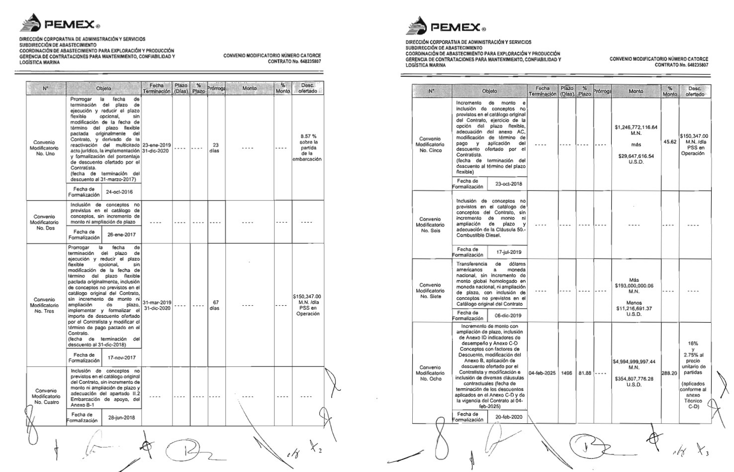 Sin embargo, a través de 14 convenios de ampliación de monto y plazo, nueve de ellos en la administración de Octavio Romero Oropeza, el contrato 648235807 amplió un 333.82% el monto original llegando a los 7,969 millones de pesos más 507 millones de dólares, y el plazo de ejecución se fue hasta el 4 de febrero del año 2025, un 81.88% al plazo original
