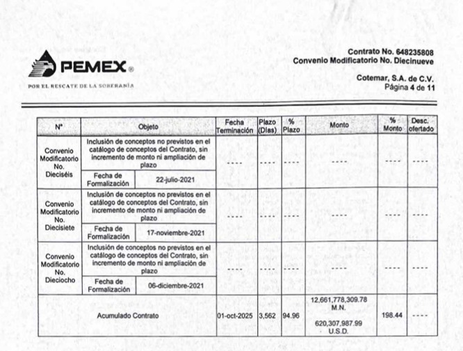 El más reciente contrato asignado el pasado 31 de octubre de 2022 a COTEMAR es el 640852825, por un monto que supera los 3 mil 702 millones de pesos, y por el que PEMEX ya le adeuda por trabajos facturados la suma de 314 millones 338 mil 770 pesos.