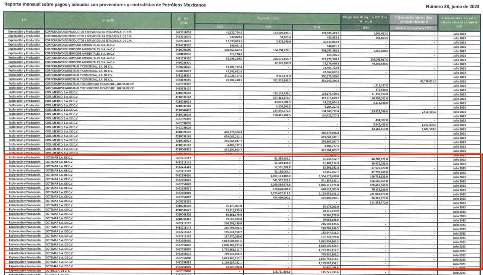 Basta señalar que, según el reporte No. 28 mensual de pagos y adeudos de Pemex de junio, entre los años 2022 y 2023, sólo por los contratos 648235806, 648235807 y 648235808, COTEMAR, empresa fundada por Mario Dávila Dávila y María Cristina Lobo Morales, y que hoy dirige Alejandro Villarreal Martínez, ha recibido remuneraciones por más 12 mil 174 millones de pesos.