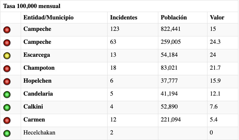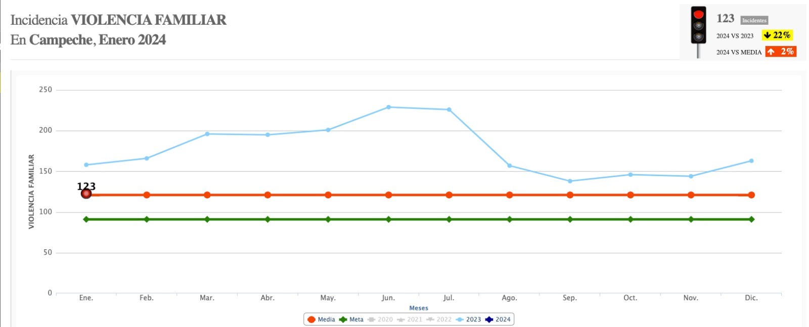 De acuerdo con la estadística de Semáforo Delictivo de Campeche, en el 2023, en el estado de Campeche se registró 2119 incidencias de violencia intrafamiliar, los meses con mayor incidencia de ese delito fue en junio con 229 y en julio con 226.