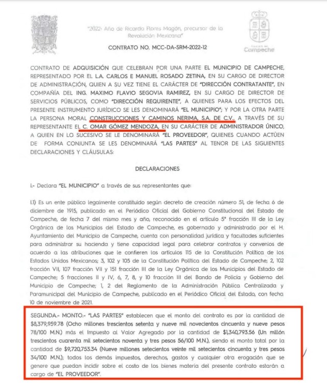 Un mes después, Construcciones y Caminos Nerima SA de CV firmó el contrato MCC-DA-SRM-2022-12 exactamente por el mismo concepto: adquisición de materiales para la rehabilitación de superficies de rodamiento con slurry, en diversas calles de la ciudad de Campeche, pero ahora el monto fue de $9,720,753.34 pesos.