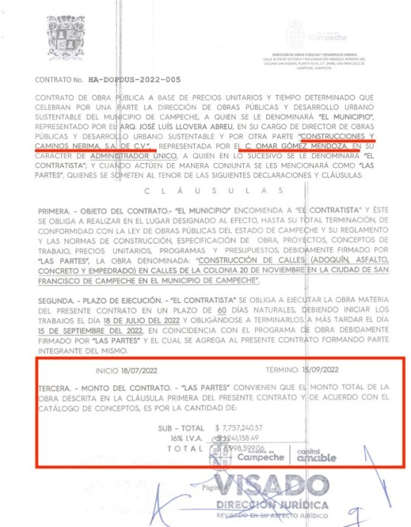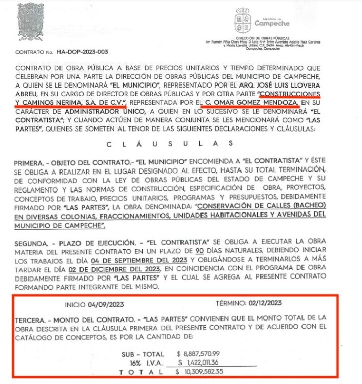 A la fecha, la empresa Construcciones y Caminos Nerima SA de CV ha firmado tres de los grandes contratos en el municipio de Campeche, a través de la Dirección de Obras Púbicas y Desarrollo Urbano, que dirige José Luis Llovera Abreu, que suman en conjunto un monto de $29,028,734.75 pesos.