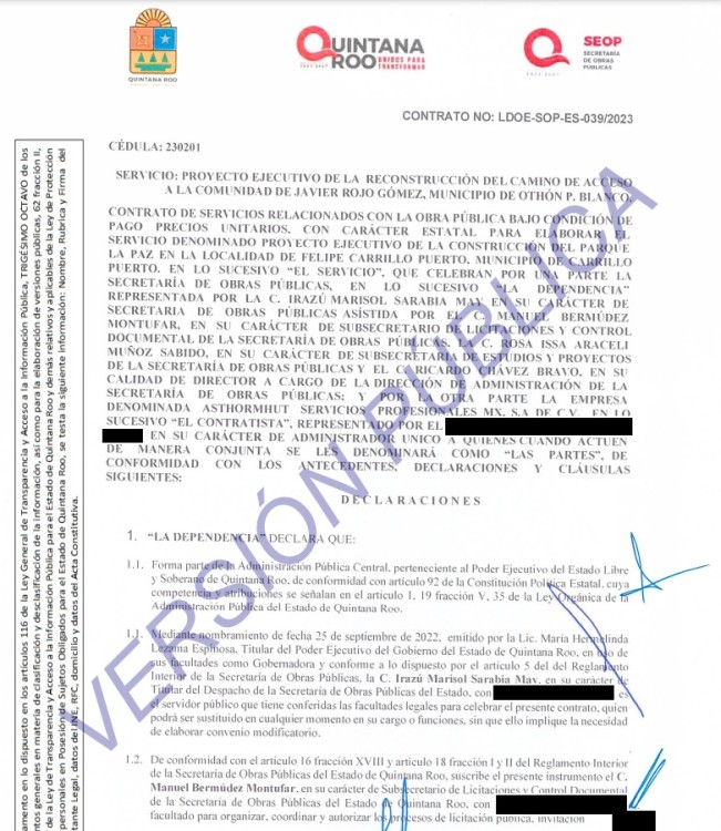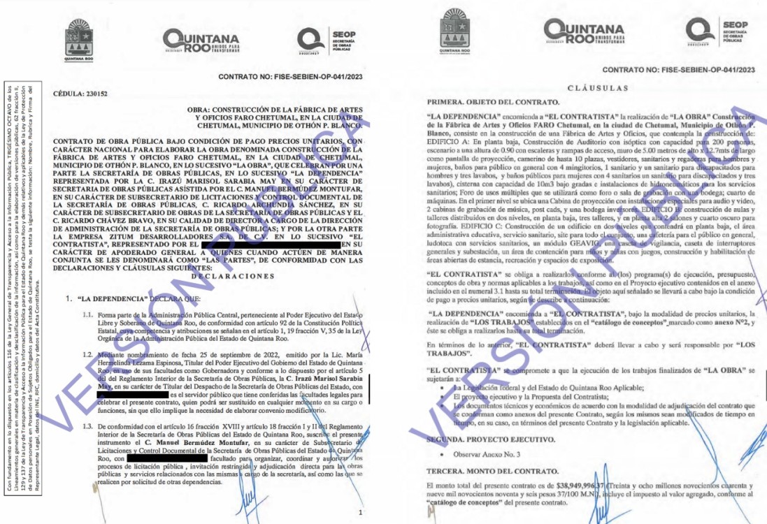 Según copia de los contratos entregados a LA CHISPA, durante el último trimestre de 2023, la SEOP firmó un total de 22 contratos, 17 fueron para empresas constituidas fuera de Quintana Roo, por ejemplo: el contrato FISE-SEBIEN-OP-041/2023 para la construcción de la Fábrica de Artes y Oficios FARO Chetumal a la empresa ZITUM Desarrolladores SA de CV, domiciliada en la calle Campos Elíseos, No. 219, en la Colonia Palmas de Polanco en la CDMX, y es representada por José Carlos Velázquez Vilchis, por un monto de 33 millones 577 mil 583.08 pesos.