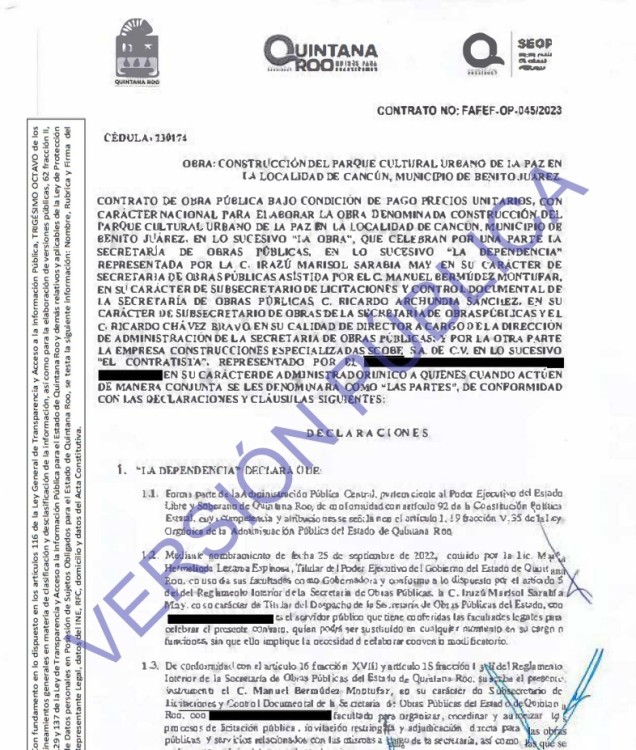 Construcciones Especializadas Scobe SA de CV, constituida en Tampico, Tamaulipas, y representada por Víctor Antonio Domínguez Cervantes firmó el contrato FAFEF-OP-045/2023 para la construcción del Parque Cultural Urbano de La Paz en Cancún, por la suma de 16 millones 994 mil 879.92 pesos.