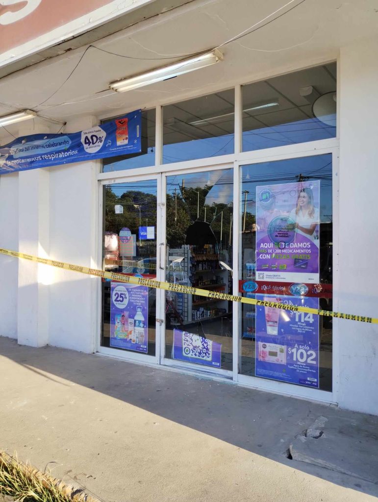 De acuerdo con la información que se obtuvo, él o los delincuentes arrojaron una roca contra una de las puertas de vidrio de la farmacia.