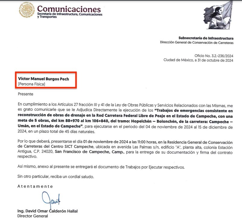El único contrato adjudicado para obras viales fue a través de la licitación IO-09-211-009000959-N-260-2024 para conservación rutinaria de tramos en 243.57 km, en las rutas 180, 186, 201 y 259 de las vías federales correspondientes a Campeche, que fue adjudicada a la empresa Construcciones y Conservaciones Calakmul SA de CV, de Jorge Manuel Gordillo Coral, por un monto de $14,652,898.50 pesos.