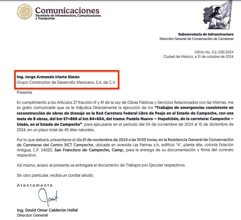 El primer contrato fue para trabajos de emergencias consistente en reconstrucción de obras de drenaje en la red carretera federal libre de peaje en el estado de Campeche, con una meta de 8 obras, del km 57+868 al km 84+664, del tramo: Pueblo Nuevo-Hopelchén, de la carretera Campeche-Umán, que fue adjudicada a la empresa Grupo Constructor de Desarrollo Mexicano SA de CV, de las familias Hurtado Ferrer e Iriarte Hurtado, vía el contrato EMERG-CAMP-001, por un monto de $8,352,108.44 pesos.