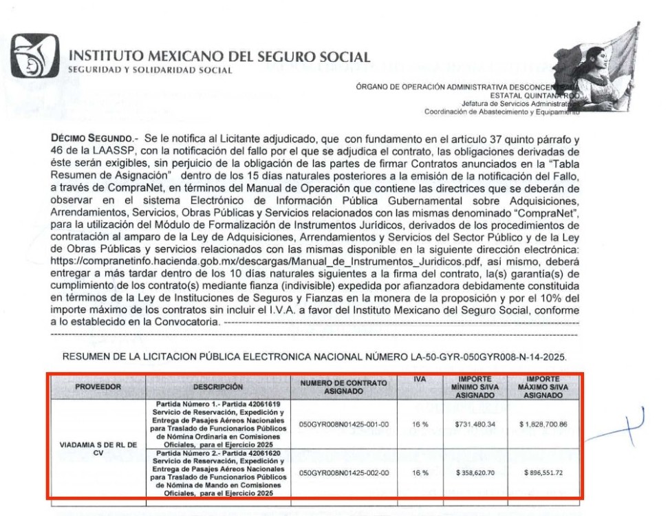 Siendo Quintana Roo un destino 100 por ciento turístico, donde existen agencias de viajes al por mayor, el Instituto Mexicano del Seguro Social (IMSS) entregó el contrato para el servicio de expedición, reservación y entrega de pasajes aéreos para servidores públicos de mando en el desempeño de comisiones y funciones oficiales, a la empresa VIADAMIA S de RL de CV, que opera desde Ensenada, Baja California, pero fue constituida en Guadalajara, Jalisco.
